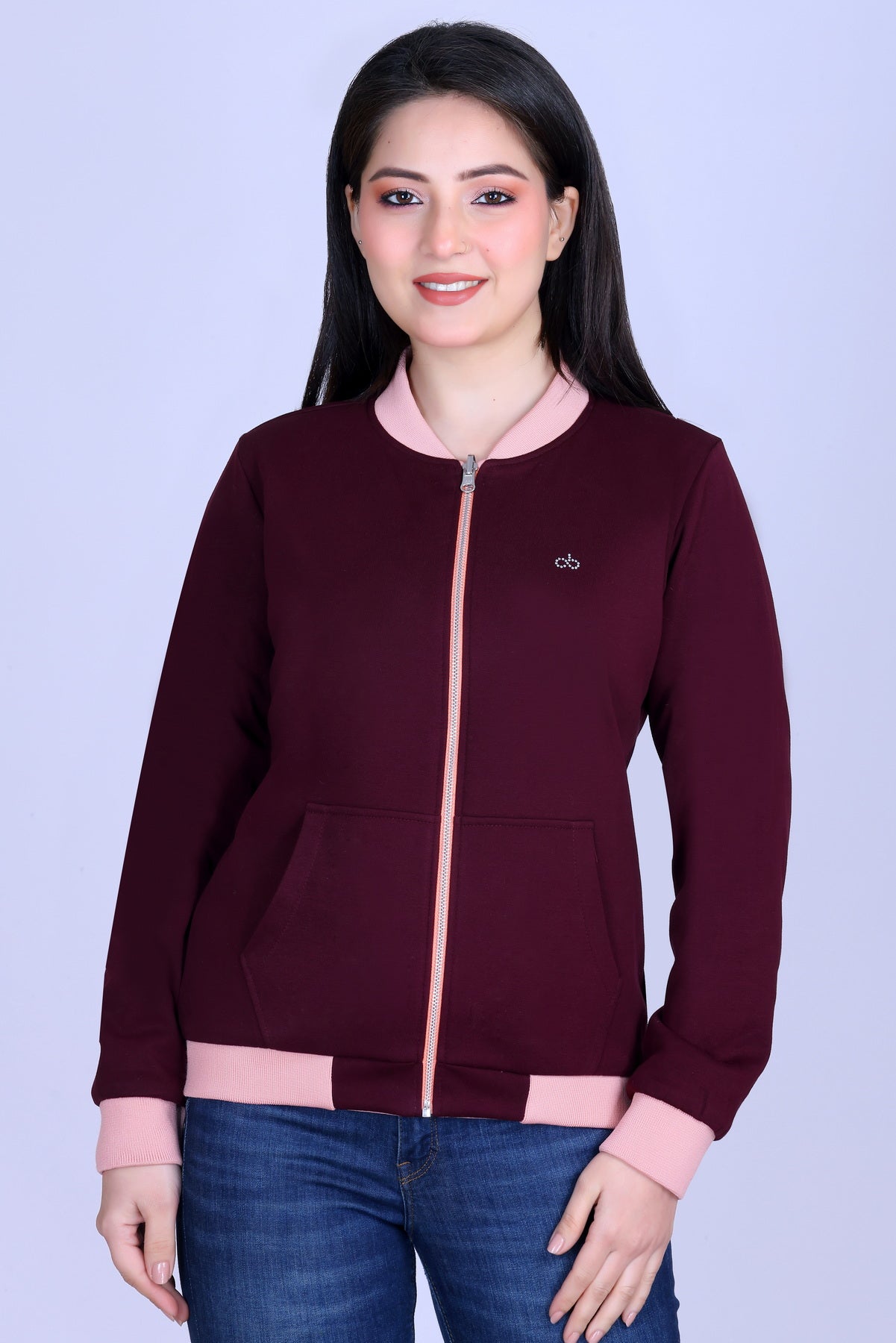 Both sides include angled side pockets for hands-free warmth and essentials like keys or phone. Pockets integrate seamlessly into the bomber silhouette, offering convenience without bulk. Functional design suits casual outings, jogging, or layering over jeans.