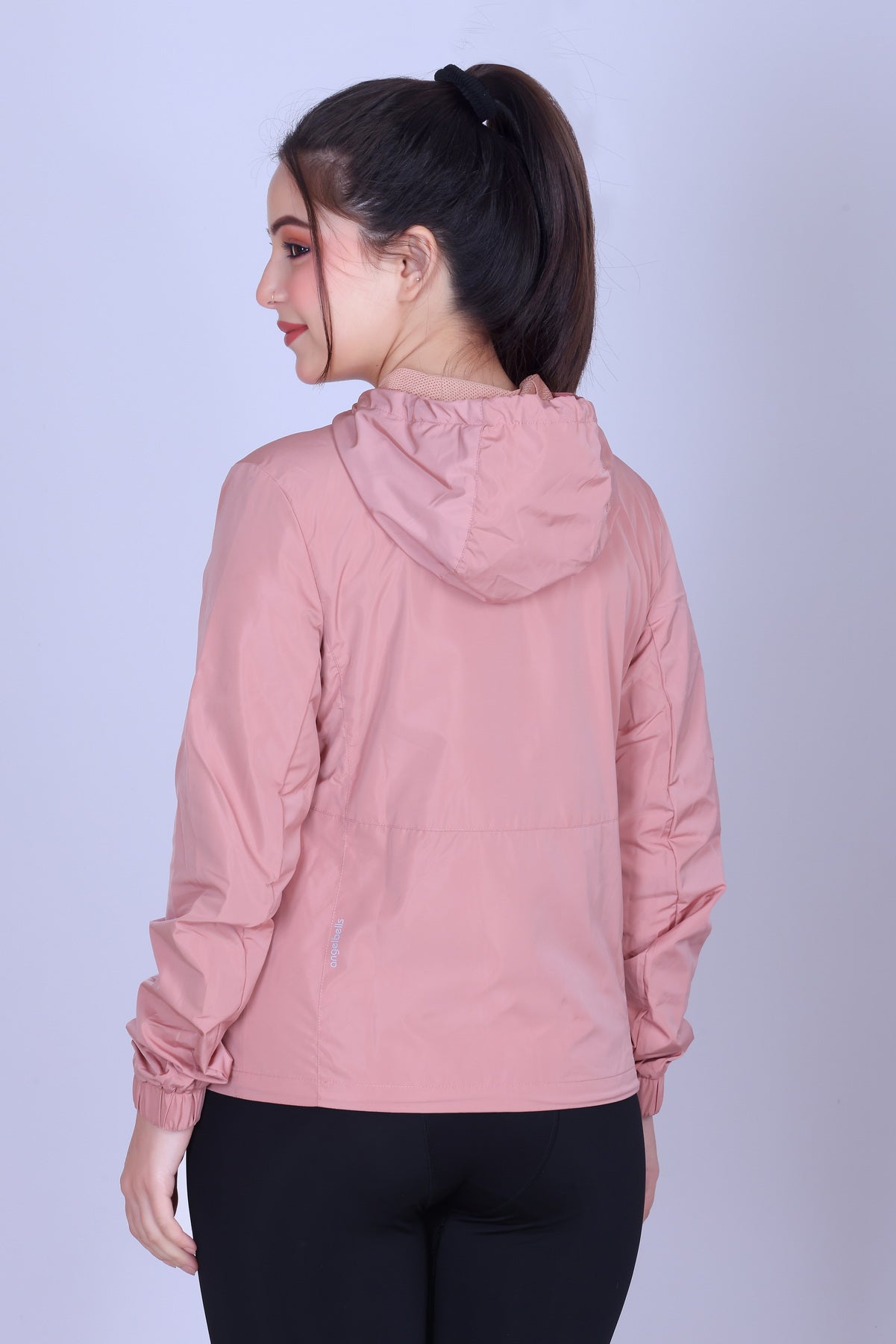 Premium nylon shell offers a smooth, packable texture that's quick-drying and abrasion-resistant. This fabric maintains shape after repeated use, perfect for e-commerce branding like Angelbells activewear.