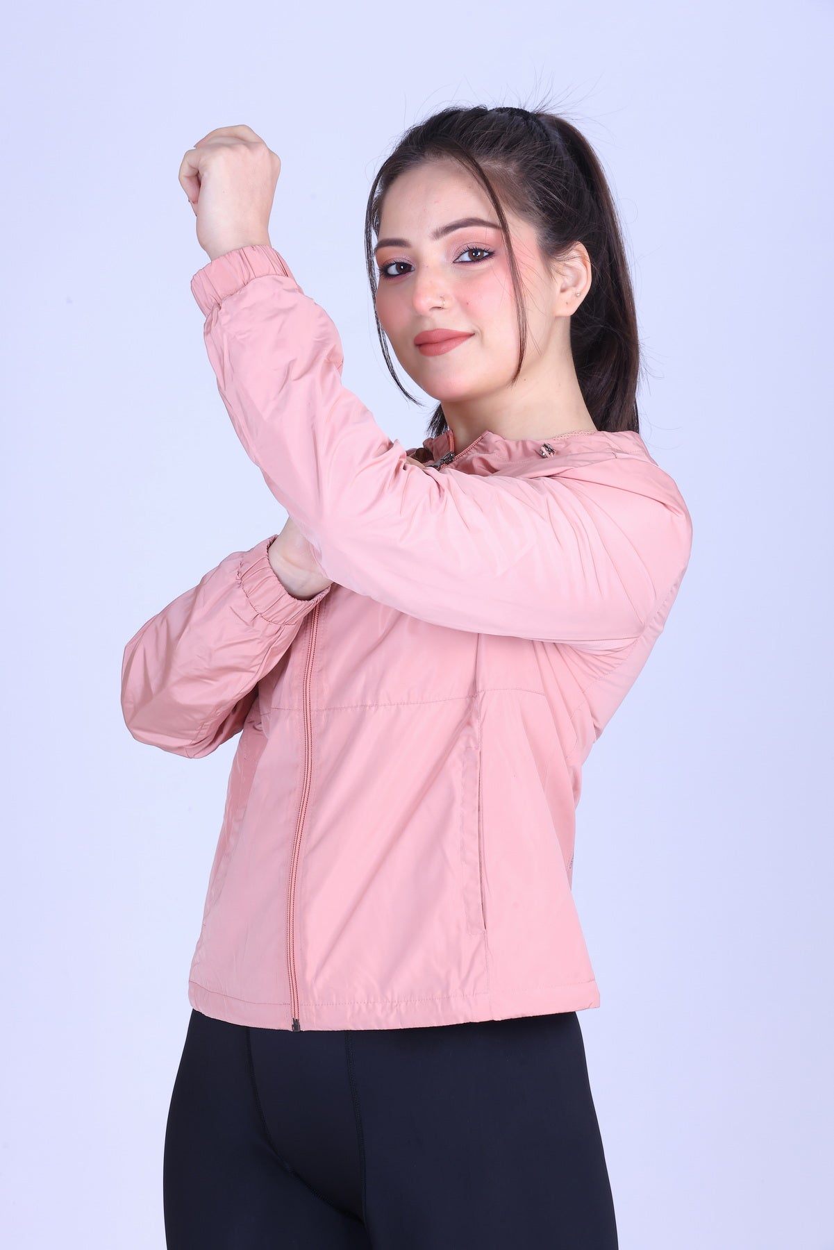This pink hooded jacket showcases windproof qualities ideal for active wear. Detailed features highlight its functional design for everyday use.