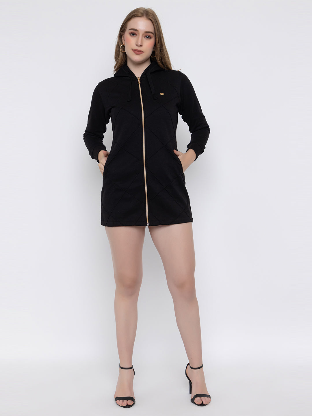 ANGELBELLS | Cozy Chic Fur Fleece Longline Hoodie Dress with Golden Zipper & Hip-Cover Design